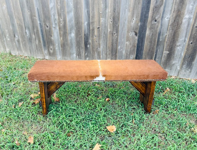 Each bench is handcrafted by my 95 year old father using only the highest quality materials. The tops are genuine hair-on-hide cowhide. The legs are counter-sunk into the top and then braced underneath to prevent any side-to-side movement. The decorative pieces on the sides of the legs not only add a decorative flare, but they prevent any splitting of the wood that might otherwise naturally occur over time. No nails are used, only wood screws. These benches are built to LAST!!!