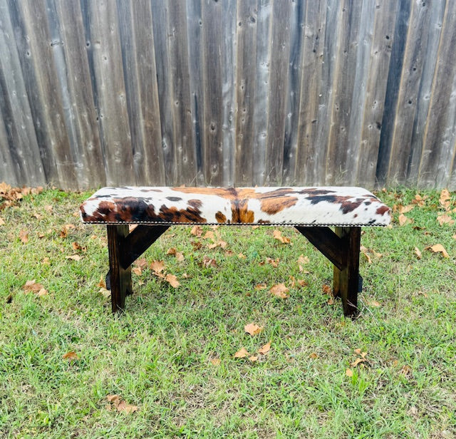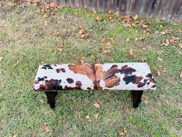 Each bench is handcrafted by my 95 year old father using only the highest quality materials. The tops are genuine hair-on-hide cowhide. The legs are counter-sunk into the top and then braced underneath to prevent any side-to-side movement.  The decorative pieces on the sides of the legs not only add a decorative flare, but they prevent any splitting of the wood that might otherwise naturally occur over time.  No nails are used, only wood screws.  These benches are built to LAST!!!
